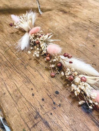 Fleurs séchées : statice, lagurus, broom bloom, gypsophile, phalaris, eucalyptus… Ou encore des trésors glanés dans nos forêts : fougères, bruyères, pampas… Fil de fer fin Floratape (ruban adhésif extensible) Pinces coupantes et ciseaux Ruban ou ficelle naturelle pour l’attache et le nœud Pistolet à colle ou colle liquide Optionnel : mini pommes de pin, baies ou paillettes dorées pour une touche festive